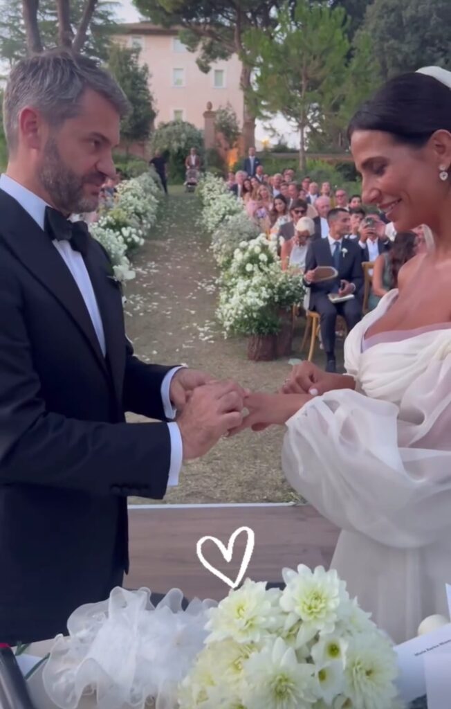 Tra i tanti ospiti e amici, Veronica Angeloni, con l’ex pallavolista italiana in abito lungo, con stampa foliage tropicale all-over. Chiara Piscedda ha indossato un abito slim fit stile anni Quaranta, con macramè marrone e spalline con scollo all’americana. Il produttore musicale Alessandro De Angelis in abito classico a tinta unita nero.