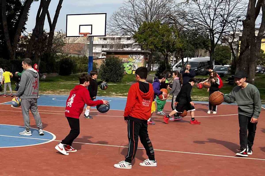 Un gesto simbolico, allegro, divertente, organizzato per far sentire la propria voce o, meglio, il suono dei palloni, all’intolleranza di chi ha segato uno dei canestri del campetto.
