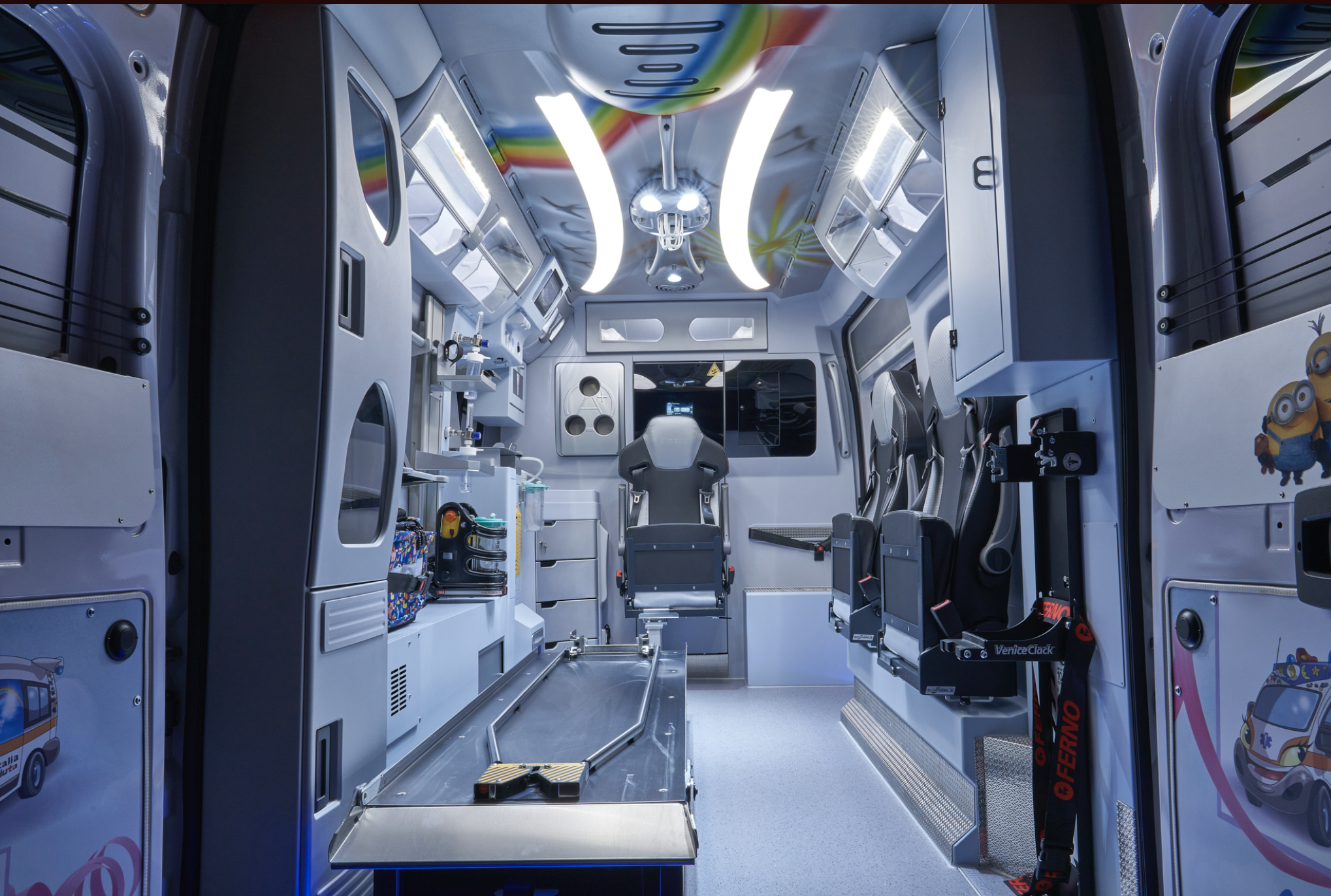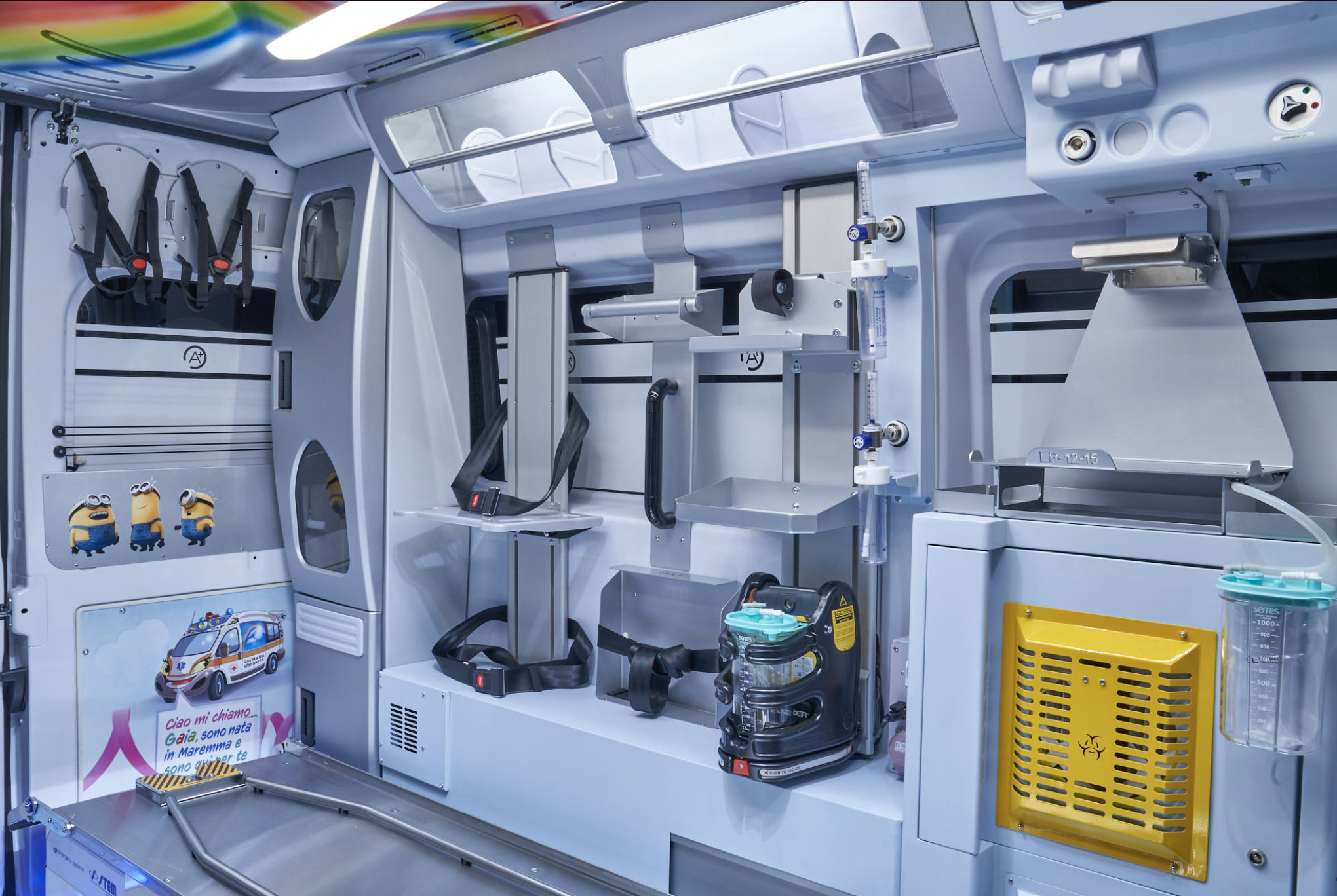 Insieme ai due posti a sedere della cabina di guida, oltre al paziente, l’ambulanza è in grado di trasportare tre operatori nel vano posteriore per l’alloggiamento della barella.