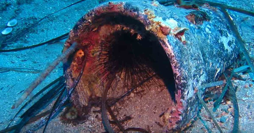 Un primo pedagno (pallone che da convenzione per il tour, segnala la presenza di rifiuti e viene lanciato in superficie dai subacquei in immersione) ha rilevato la presenza di un grosso tubo in ghisa. Sembrerebbe un grosso raccordo, ma l’identificazione non è mai semplice a causa delle numerose concrezioni presenti. Il secondo pedagno lanciato in superficie è collegato ad un reticolo di cime, sagole e vecchie reti presenti sul fondale, impigliati agli scogli e che vanno a perdersi sotto la sabbia: sembra che il fondale sia coperto da una vera e propria ragnatela di fattura umana, generata proprio da un numero spropositato di cime di diverse dimensioni, forse appartenenti a vecchie reti delle quali non è rimasto più nulla.