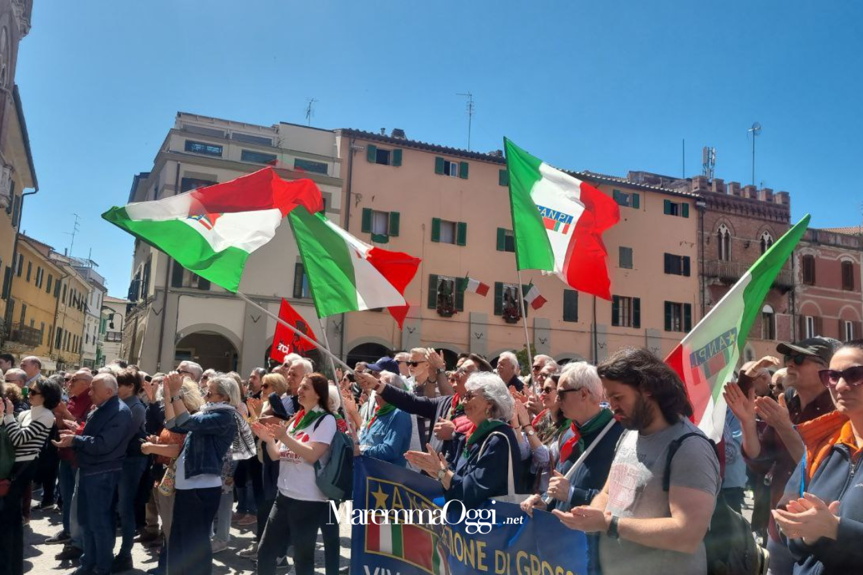 «In piazza si viene per ascoltare, non per farsi vedere». È un Leonardo Marras che infiamma la piazza e che fa il pieno di applausi quello che parla di fronte alla porta del palazzo Aldobrandeschi. «Ricordo ancora quando per celebrare il 25 aprile veniva montato il palco in piazza. Parlava una persona sola – dice – Io da presidente della Provincia ho avuto l’onore di farlo due volte».