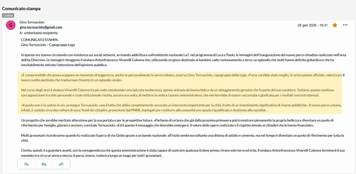 A intervenire è Gino Tornusciolo, capogruppo della Lega in consiglio comunale. Le sue parole non sono una battuta di passaggio, ma una critica politica chiara, che segna una frattura sul piano della comunicazione istituzionale.