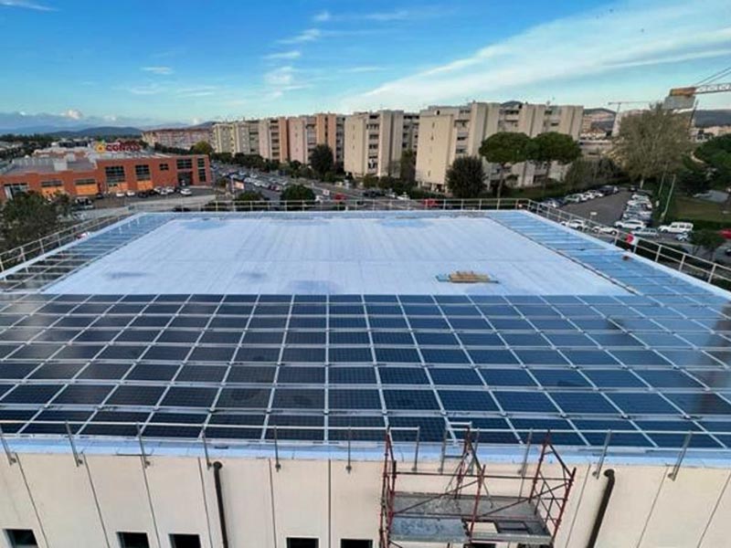 I lavori sono stati eseguiti nell’ambito di due distinti appalti: il primo e più complesso, che è stato portato a completamento nel periodo post pandemia caratterizzato sia dalla difficoltà di approvvigionamento dei materiali che dalla successiva crisi energetica internazionale, ha previsto il rifacimento dell’impermeabilizzazione della copertura della palestra e l’installazione dell’impianto fotovoltaico per la produzione di energia.