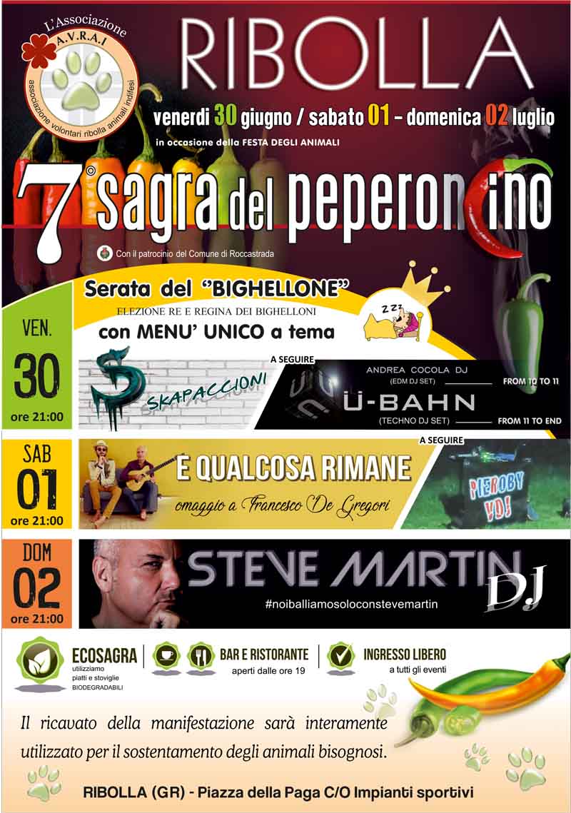 L’associazione Avrai organizza la sagra del peperoncino, dal 30 giugno al 2 luglio. L’intero ricavato sarà utilizzato per il sostentamento degli animali bisognosi.